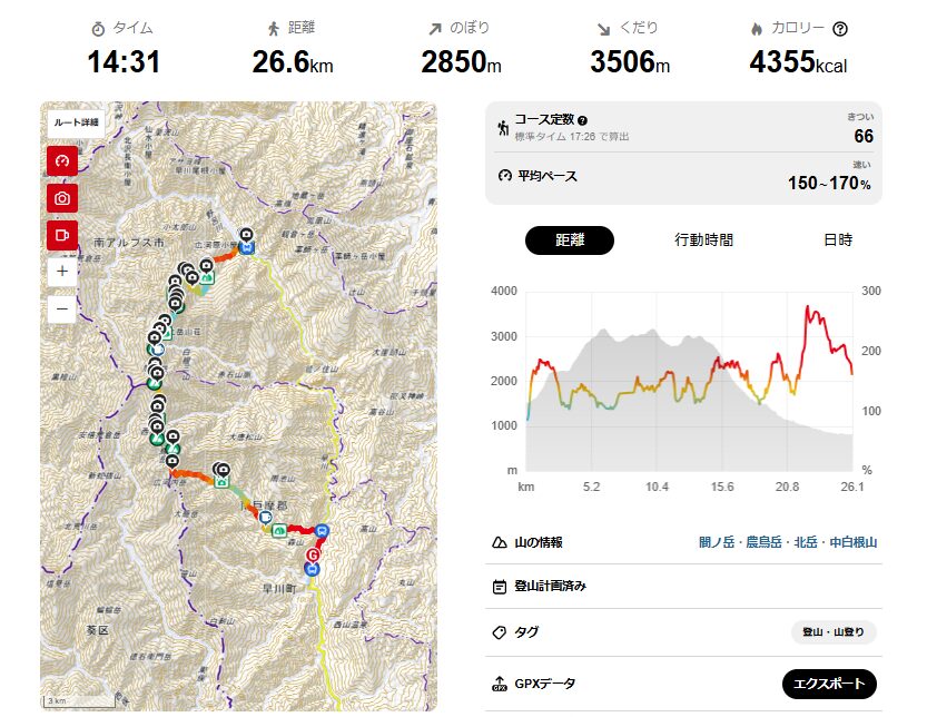 ルート、時間、累積標高