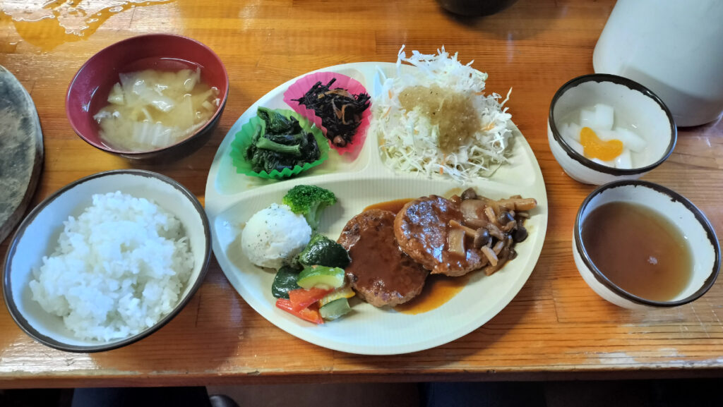 夕飯のハンバーグ定食は、なかなかおいしい。
