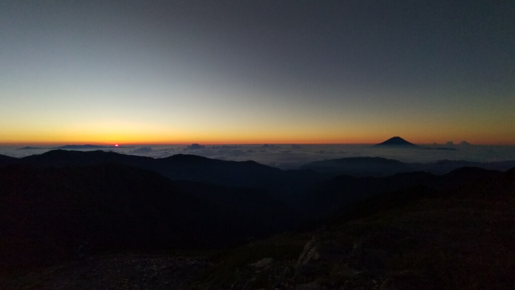 翌朝、北岳山荘あたりから日の出を見ようかと考えたが、日が出る場所が北岳方面で、北岳に隠れて綺麗に見れないことがわかり、中白根山頂まで行って見ることにした。