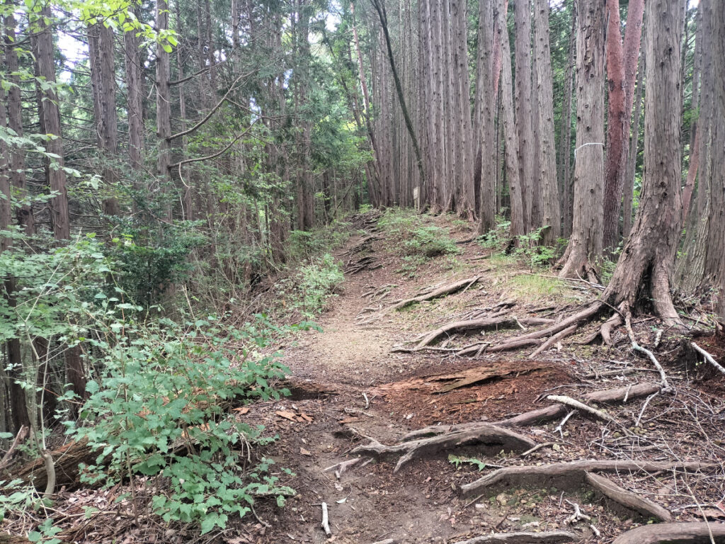 理由は単純。登っては下って、また登って…を延々繰り返すから。 下りでは調子に乗ってスピードを出してしまうので、脚の疲労が倍増します。 そして、同じような景色が続くため、実際の距離以上に長く感じるのも特徴。 加えて登山者が少なく、今回すれ違ったのはわずか3組ほど。 鬱蒼とした森の中を黙々と歩くのは、メンタルにも地味に効きます。